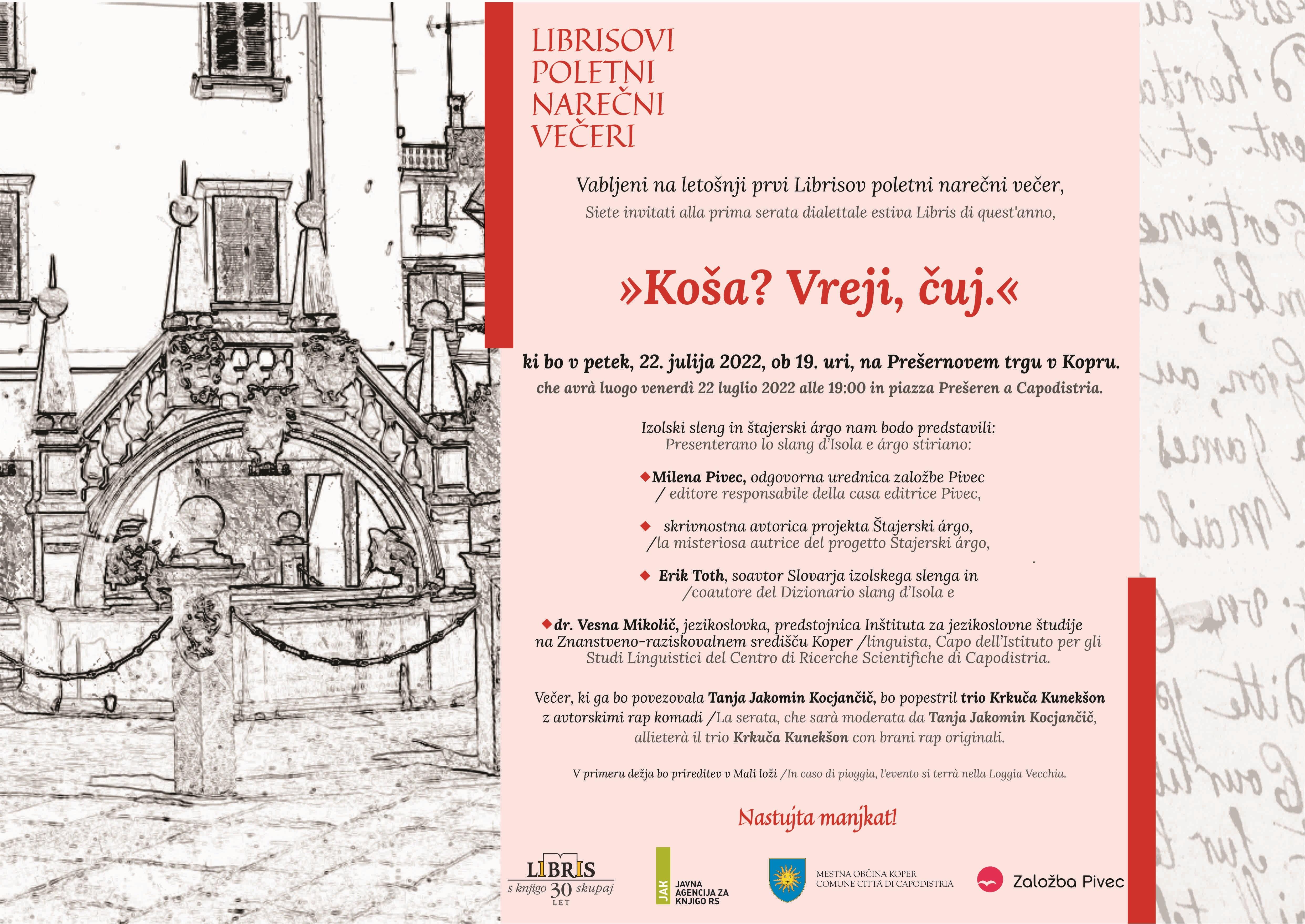 Letošnji Librisovi poletni narečni večeri se odvijajo že devetnajsto leto zapored. Običajno jih pripravimo na podeželju slovenske Istre, tokrat pa smo za prizorišče prvega večera izbrali staro mestno jedro, saj bomo pozornost namenili izolskemu slengu in štajerskemu árgu, interesnima zvrstema, ki se pojavljata v bolj urbanem okolju. Za naslov večera smo izbrali kombinacijo besed obeh interesnih govoric, sleng in argo: »Koša?«, ki se nanaša na vprašanje oziroma pozdrav med prijatelji »Kako si?«, in »Vreji, čuj.«, ki predstavlja odgovor »Dobro sem.«